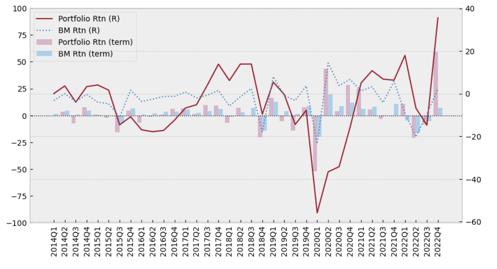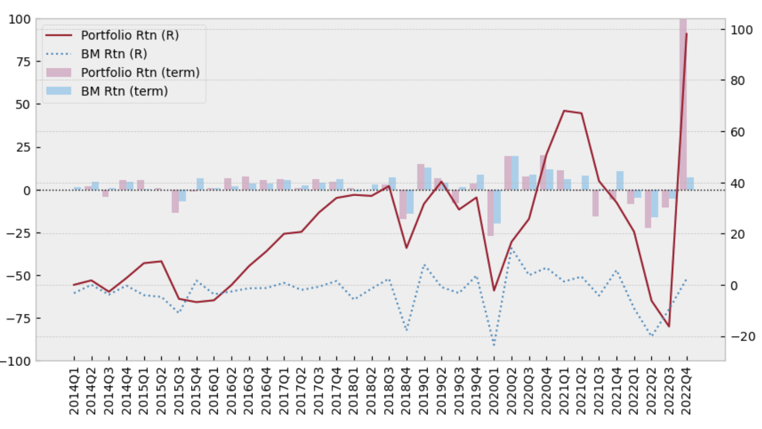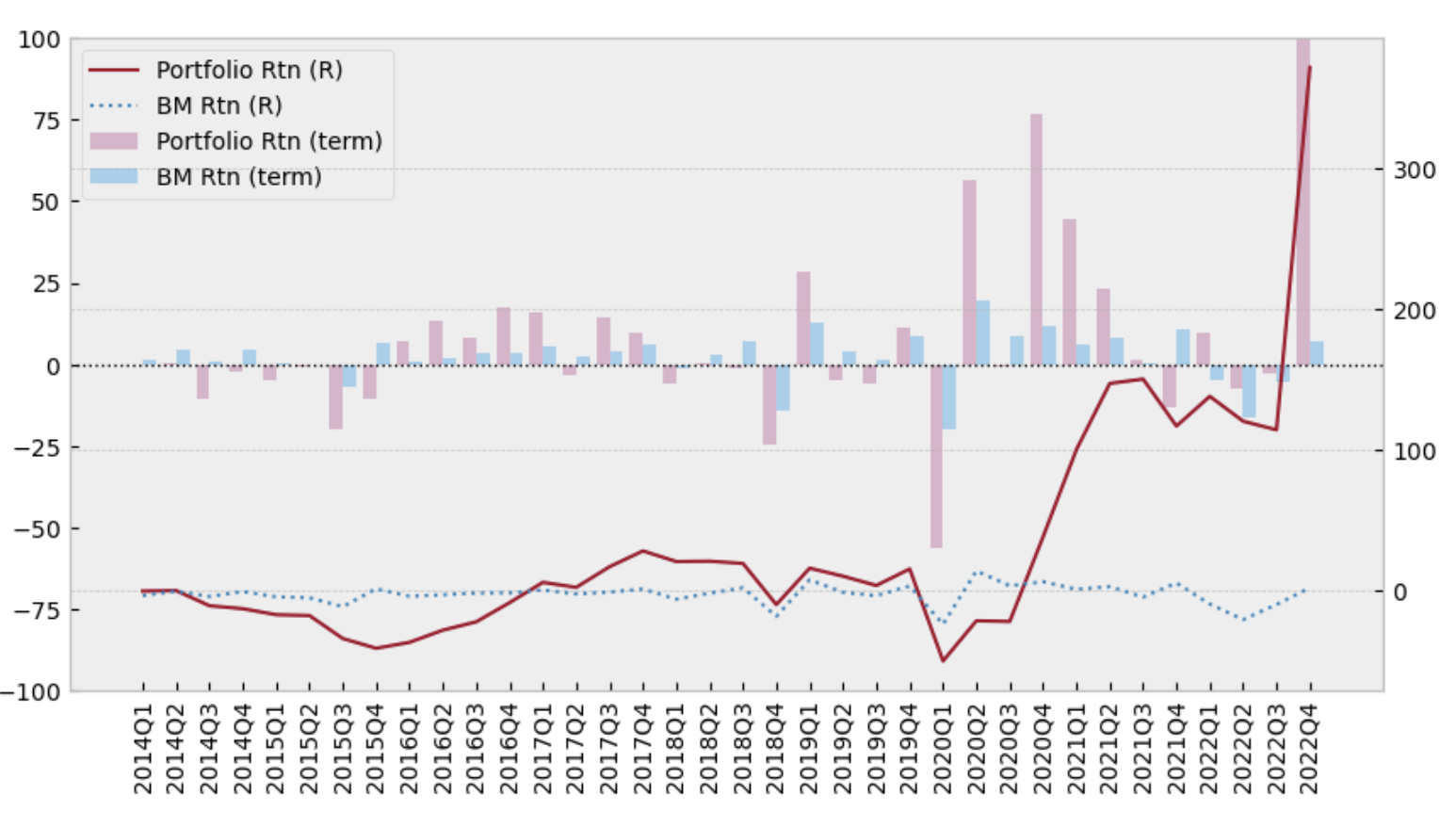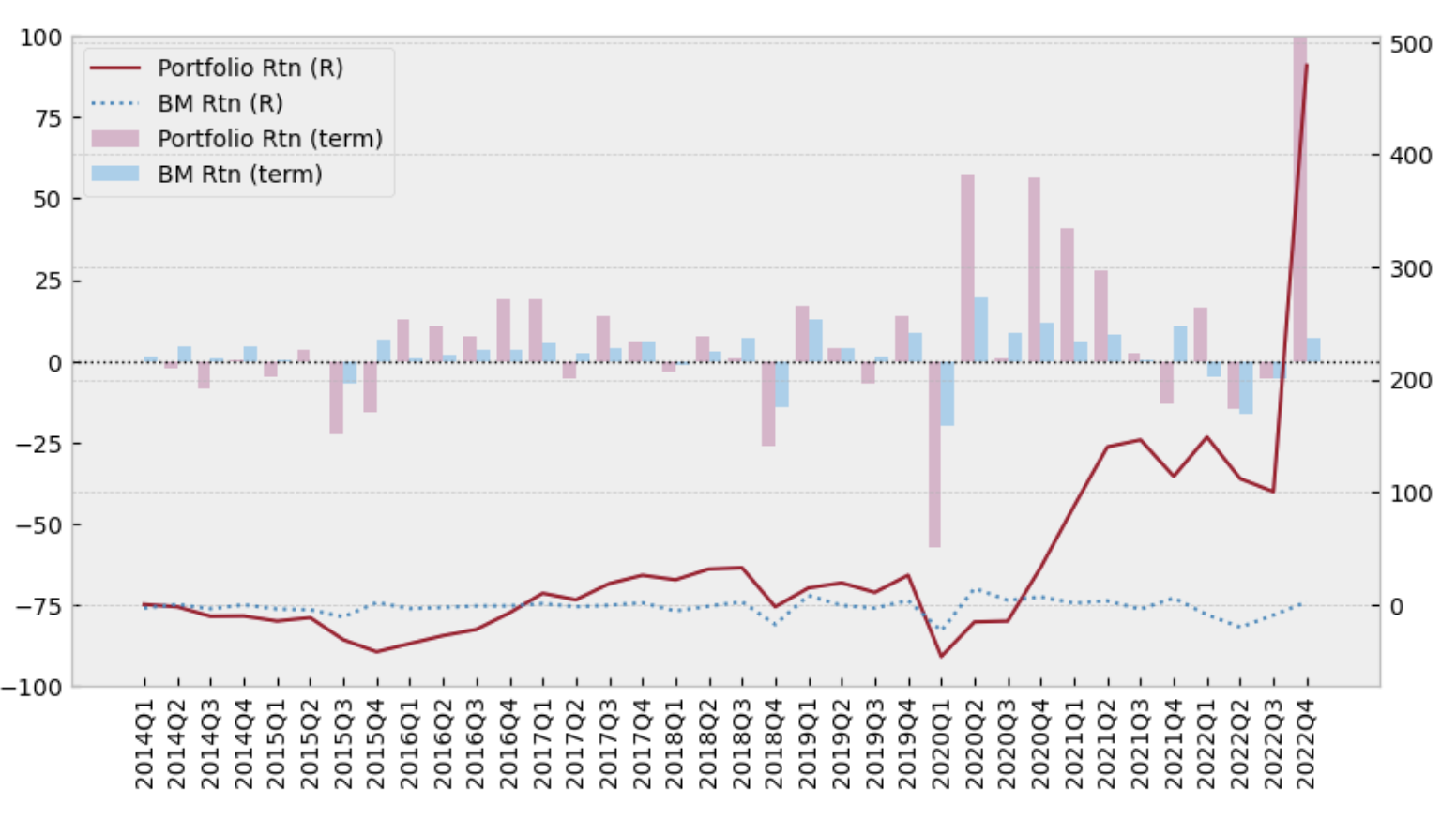 기간은 위와 동일하게 2014년부터 2022년까지 차입금 비율이 낮은 종목 30개를 골라서 분기(3개월)마다 리밸런싱을 해보자.