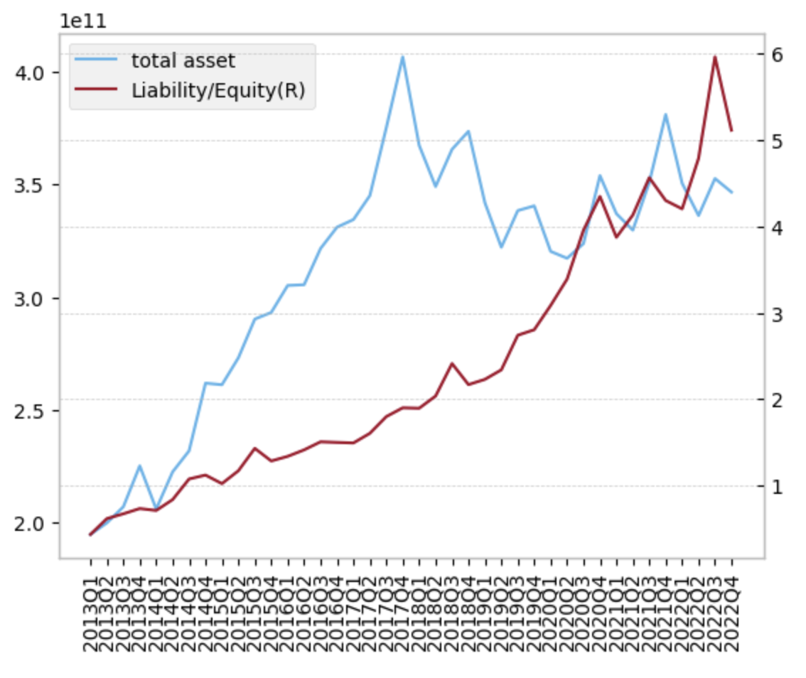 그렇다면 애플 종목을 이용하여 부채비율과 총자산의 상관관계에 대해서 확인해보자.