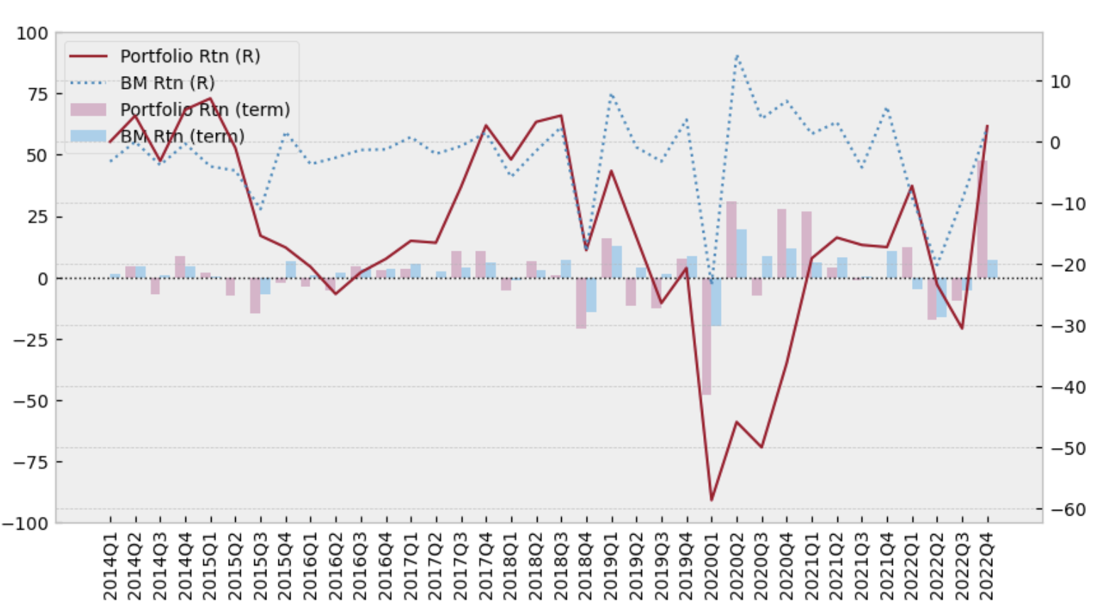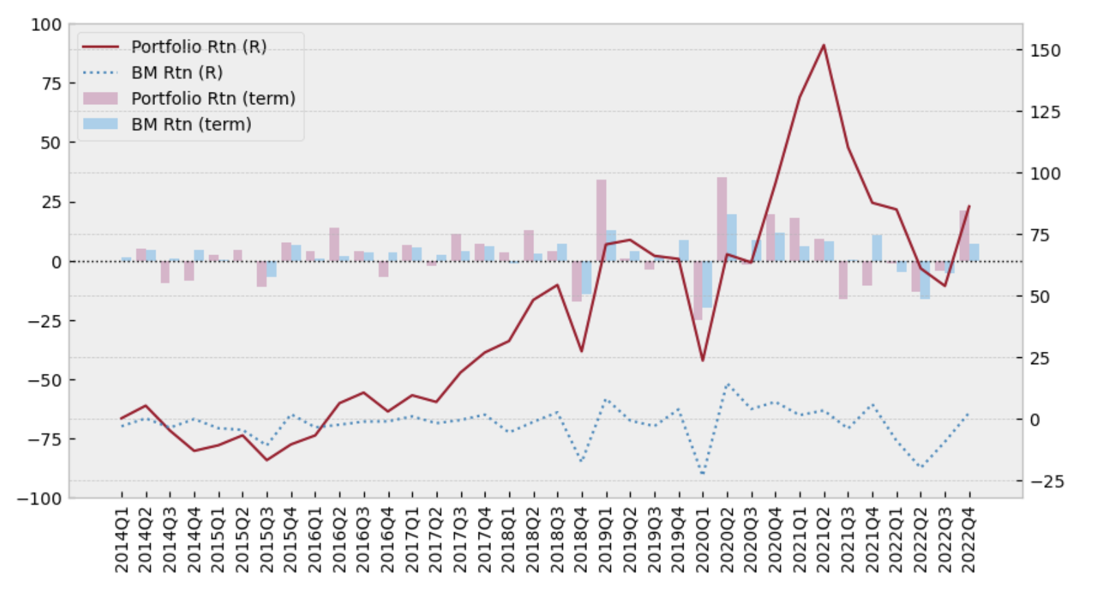 백테스팅은 2014년부터 2022년까지 부채비율이 낮은 종목을 30개 골라서 분기마다 리밸런싱하는 전략이다.